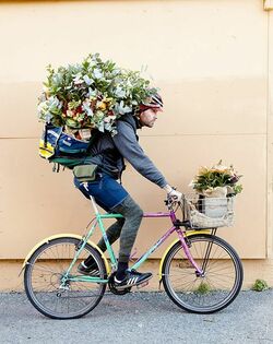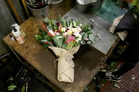 花束は季節によって、またそのときの仕入れによっても変わってくる。仕入れ先の切り花生産農家の中には、ステンベルのニーズに合わせた花を栽培するようになったところも多い。ステンベルが好きな花材は葉ボタンで、赤いバラは嫌いだ。ラッピングには使用済みのコーヒー豆用の麻袋が使われる。これは地元のコーヒー焙煎業者から提供してもらったものだ。