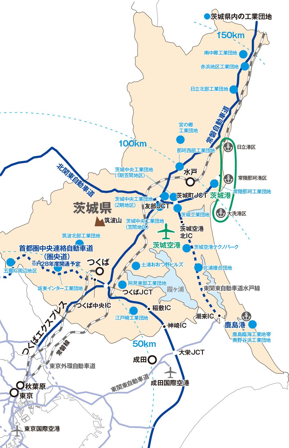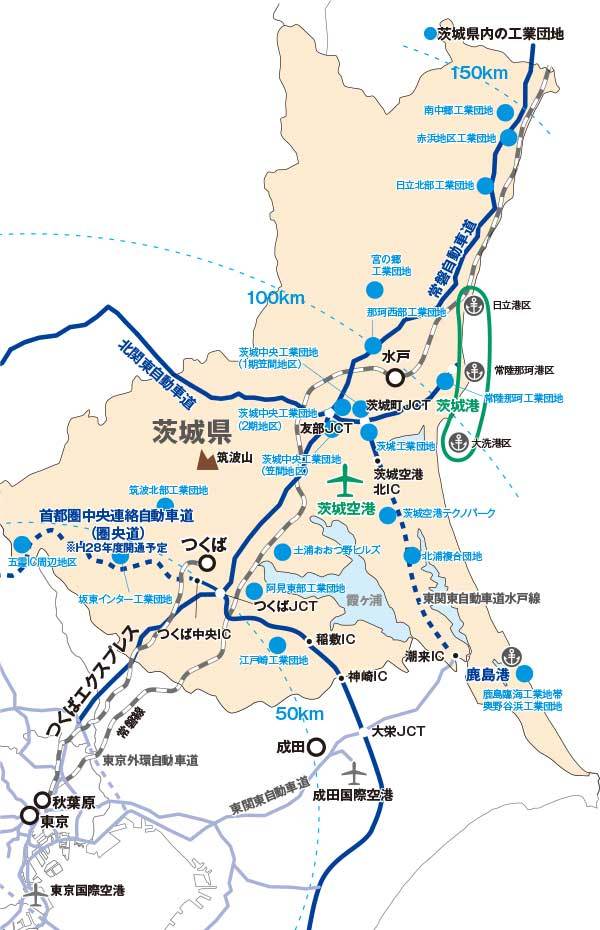 また首都圏から100キロ圏という立地メリットをさらに高めているのが、交通インフラ。茨城県内には南北に走る常磐自動車道、東西を横断する北関東自動車道、県南・県西地域を横断する首都圏中央連絡自動車道(圏央道)、鹿行地域を南北に走る東関東自動車道水戸線の4本の高速道路がある。