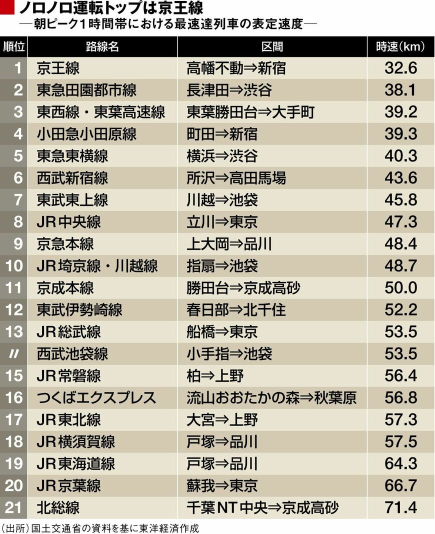ワーストは京王線(高幡不動⇒新宿)の時速32.6キロメートル。スクーター程度のスピードで走っていることになる。