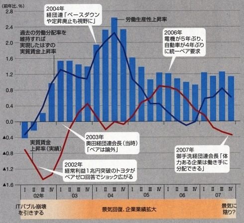 この起点となったのが、トヨタのベアゼロだった。史上最高益のトヨタがベアゼロに踏み切ったことで、他の企業も追随。05年まで賃金抑制期が続くことになる。