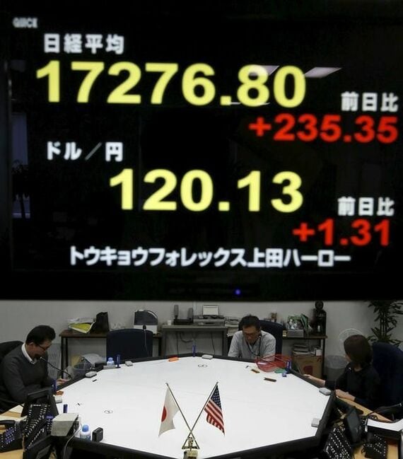 1月29日、日銀は金融政策決定会合で、封印していたマイナス金利の導入に踏み切り、目標に掲げる2%の物価安定目標達成に強い意志を示した。金融市場は株高・円安で反応し、日銀の「奇襲」が成功したように見える。都内で外為取引会社で撮影(2016年 ロイター/Yuya Shino)