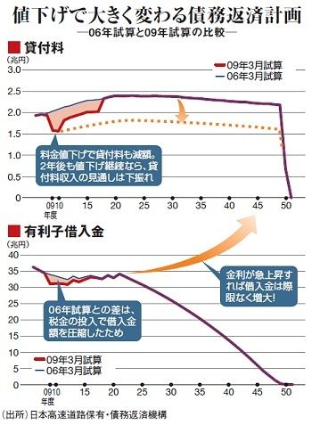 機構側の計画では、高速道路機構が高速道路各社から受け取る貸付料は料金が一定で、交通量が堅調であることを前提に、毎年約2・5兆円で安定して推移することが予測されている。一方、新規路線分の債務が順次追加された後、新規路線の建設がなくなる2021年度以降は、債務は右肩下がりに減少していく。