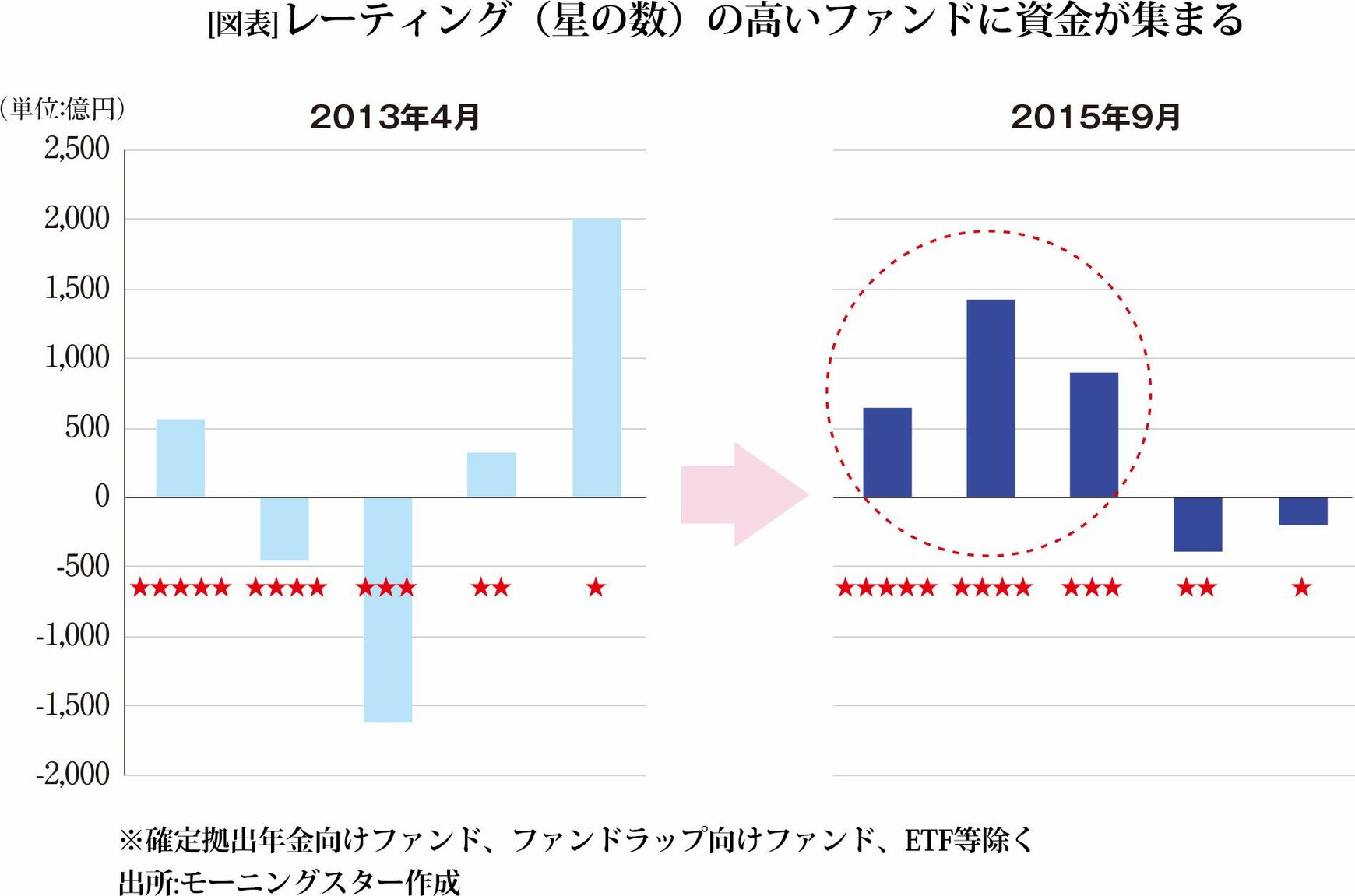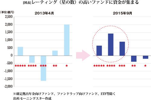 簡単に言えば、星の数が多いほど、同分類のファンドの中でリスクとリターンの両方を考慮した運用成績が良いファンドとなる。だが国内市場においては運用成績が良ければ資金が集まるのかと言えば、そう単純ではなかった。