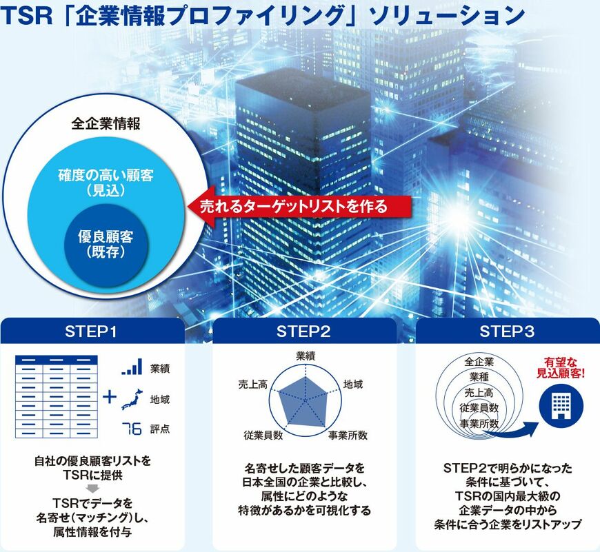 約300万社に及ぶ日本企業のデータベースを保有しているTSRは、独自のアルゴリズムを用いた名寄せのテクノロジーによって、企業のデータベースの誤りを修正することができる。「 “マッチング”と呼んでいますが、誤りを直し、ダブりや存在しない企業などを排除することによって、マーケティング活動に活用できる最新かつ正確なデータベースに転換し、新たな企業コードを付与するのです。企業が特定できれば、TSRが持っているさまざまな属性情報を付加することで、顧客の姿がはっきりと見えてくるでしょう」と弓削氏。TSRの企業データは、与信管理のための情報なので品質は高い。全国各地に拠点を構え、専門の調査員が直接企業を訪問するなどの方法で企業情報が更新されている。