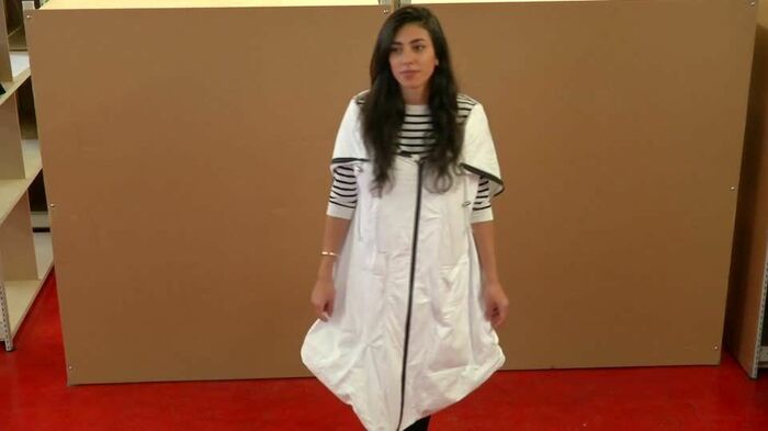 ロンドンにある美術大学ロイヤル・カレッジ・オブ・アートのインテリアデザイン&建築コースでシニアチューターを務めるハリエット・ハリス博士は以下のように語る。「難民の多くが欧州到着からセンターにたどり着くまで要する約3週間に、彼らがシェルターとしても使える衣服を考案するよう、学生に指示した。確実に使い続けられる安価な素材を基に、ごく短期間で簡単に大量生産して、複数の機関を通じて迅速に配布できるものを作ろうと考えた」