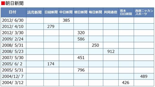 結果は次の通り、小さな文字数でしか扱っていない。縦軸はその新聞が報じた日付で、横軸は問題となった新聞社。数字はその問題を扱った文字数だ。
