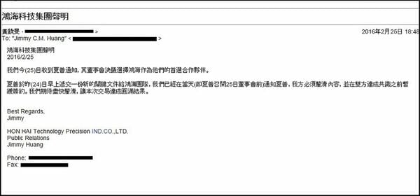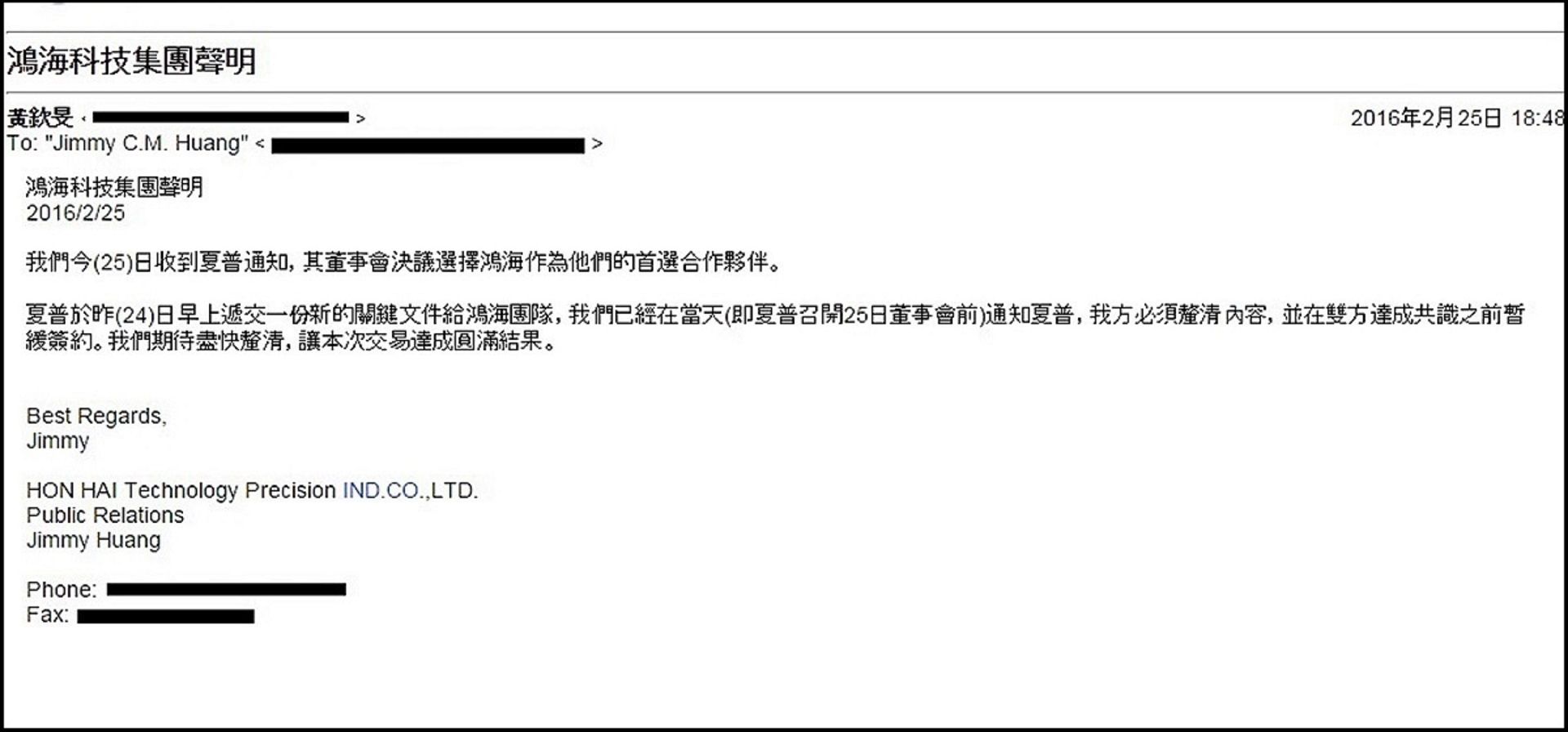 声明文によると、シャープが24日朝、新たな重要文書を鴻海側に提示したため、鴻海はシャープ側に対し、「われわれは内容を精査しなければならず、両社の共通認識が成立するまでは調印をしばらく見合わせる」と、25日のシャープの臨時取締役会が行われる前に伝えたという。鴻海の黄氏は本誌の取材に対し、「重要文書がどういった内容か明らかにできないが、24日までまったく示されてこなかった文書であることは間違いない」と答えている。
