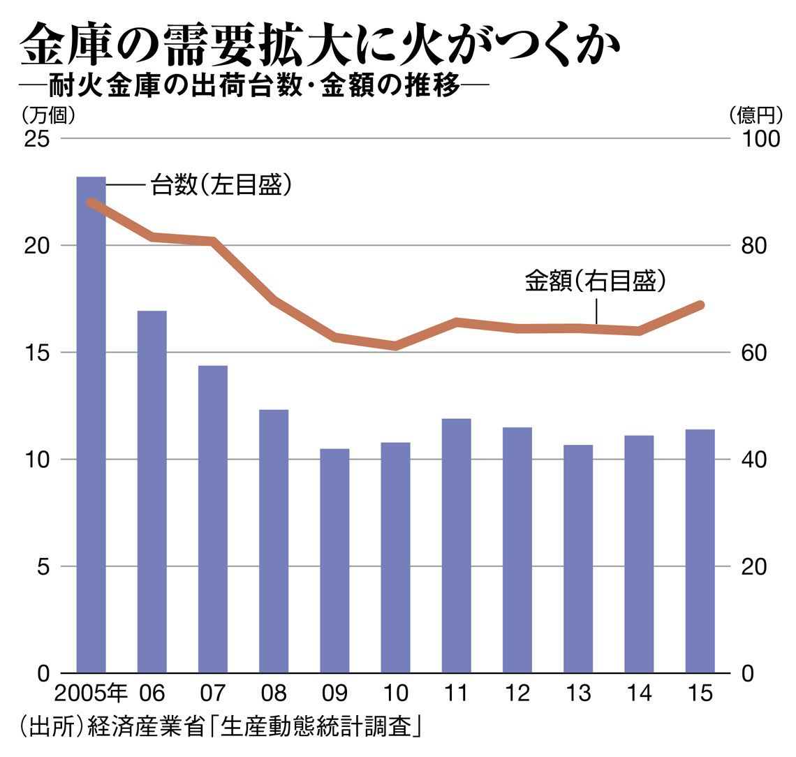 金庫はもともと、金融機関やオフィスで重要書類を保管するなど、業務用ニーズが大半を占める。経済産業省によれば、耐火金庫の出荷金額は1990年に160億円あったが、2014年には64億円へ縮小。それが2015年10月以降は、単月ベースで、前年同月比2割増の勢いだ。