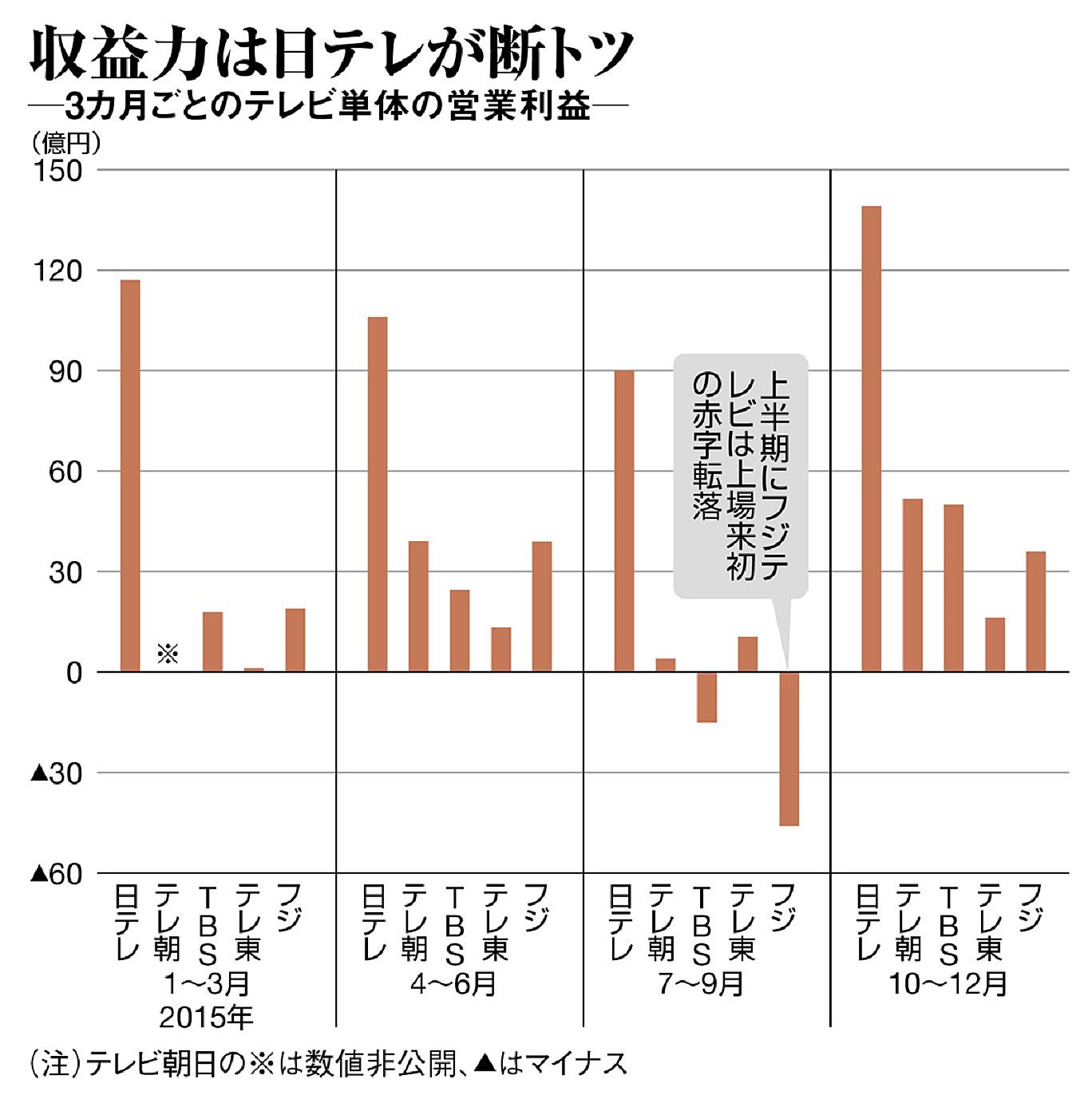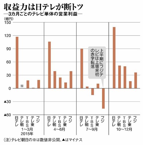 これに対して、フジはどうか。2015年度上期(4~9月期)は1997年の上場以来、初となる営業赤字(10億円)に転落した。既存のバラエティ番組で思うように視聴率を獲得できず、それが広告単価に跳ね返った。
