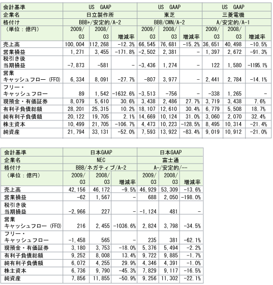 ITバブルが崩壊した後の2002年3月期を底に、日本の総合電機5社の財務内容は景気の回復や海外市場の好調と歩調を合わせて改善基調をたどってきたが、2009年3月期の5社合計の営業利益は、792億円になり、前の期の1兆2125億円から93%も減少した。また、当期損益は1兆5,277億円の赤字になり、前の期の2,981億円の黒字から一転、大幅赤字になった。その結果、株主資本は前の期末に比べて38%も減少した。フリー・キャッシュフローも大幅に減少したため、5社合計の純有利子負債も19%増加して4兆8269億円となった。その結果、営業キャッシュフローと純有利子負債、純有利子負債と純資産の比率も大きく悪化している。