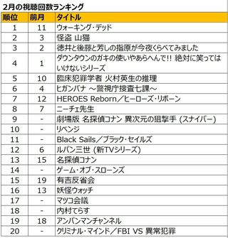 ドコモ、アマゾン、アップル、ネットフリックス・・・・。いま日本にはネット配信サイトが数多く生まれており、お茶の間でも人気を博している。そうした中で2月、もっとも観られた動画は何か。下のランキングはあくまでHuluのみのデータだが、人気動画の最新動向をチェックすることはできるはずだ。