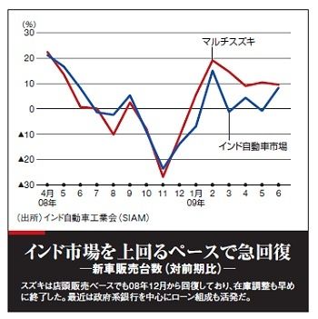 去年はそうはいかなかった。インドの新車販売は過去5年平均で17%ペースの高成長を続けたが、年初の金融危機による株価暴落で消費意欲に陰りが出た。さらにインフレに伴い金利が急騰したため、ローン頼みの車商売にはたまらない。7月に販売減へ転落。リーマンショック後は民間銀行がローン組成そのものを絞り込む事態も起こり、2008年度の全体市場は横ばい、マルチスズキの販売も1.5%増に終わった。