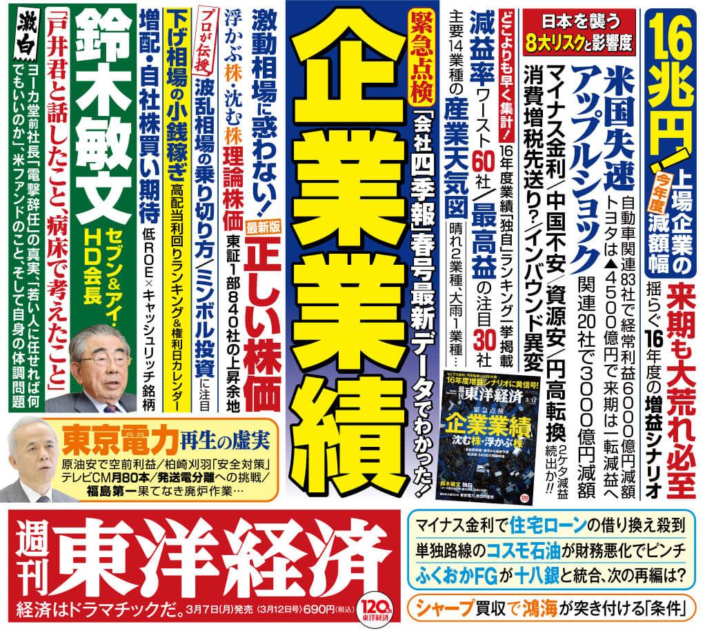 半導体製造装置で世界3位の東京エレクトロンは、一度落ち込んだ大手半導体メーカーの設備投資が復調傾向。特に、新型メモリである3次元NANDフラッシュメモリの量産が本格化することや、「iPhone7」に搭載される半導体でさらなる微細加工化の進展が見込まれていることなどが、追い風となっていると考えられる。新春号時点と比べると、上振れとまではいかないが、堅調だ。