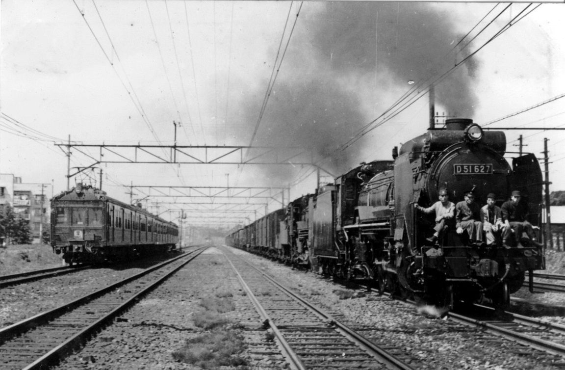 1952(昭和27)年ごろ、高田馬場-新大久保間を走る旧型国電とD51重連の牽く貨物列車(写真:大塚康生)