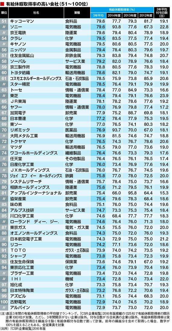 有給休暇は一般的に1年間に20日付与されるが、実際はそれ以上の会社も多い。たとえば、252位の中外製薬(61.6%)は全社員に有給の「フレックス休日」を通常とは別に4日与え、付与日数は3年とも26.4日と多い。取得日数は2012年度15.2日、2013年度16.2日、2014年度17.3日と上位企業と比べても決して悪くはないが付与日数が多いため取得率は高くない。