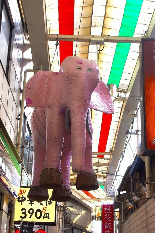 西荻窪駅の南口すぐの仲通商店街には、ピンクの象の張りぼてが吊り下げられている。この古いアーケード街でだいぶ昔からあるようだが、なんのためなのかずっと気になっていた。どうやら、昨年閉店してしまった西荻餃子の主人が考案したものらしい。年に1回下ろされて、お祭りの山車として活躍するそうである。そういえば数年前、象がいない?と思った日があった。