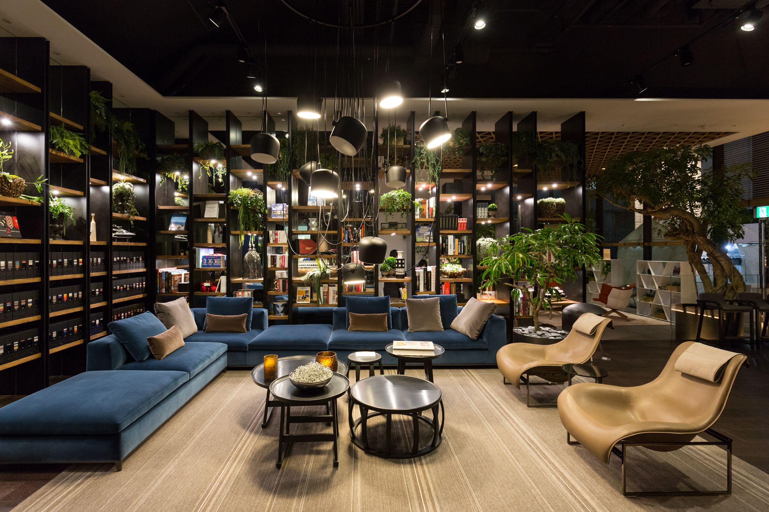青山のレクサスショールームに隣接して設けられたB&B Italiaのショールームは精力的に活動を続ける池貝知子氏によるコーディネートにより、まさにラグジュアリー空間たる提案が行われている。