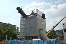 鉄人モニュメントは今月30日の完成に向け、急ピッチで建設が進められている。現在は組み立てを終えており、胴体部分が工事の作業幕で覆われているものの、全体像を垣間見ることができる。ズングリむっくりしたボディーのため洗練されたロボットという印象はないが、鋼色の全身から右腕を力強く突き出すポーズは迫力満点だ。