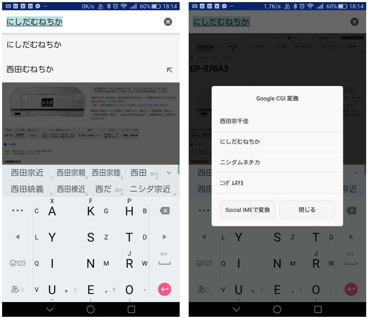 漢字変換エンジンは、Google日本語入力をベースにしたMoscなので、効率も悪くない。人名など変換が難しいものは、スペースキーを押し続けると、ネット上のクラウド変換「Google CGI API」にアクセスして、変換結果を得ることができる。さらに「Social IMEで変換」のボタンも出るので、そちらに切り替えることもできる。
