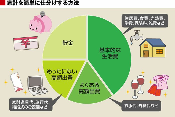 家計の収支は収入から支出を差し引くだけだ。収入は当然給料で、共働きでも収入元は2つしかない。面倒な部分は支出の計算だが、計算の際には家計の支出を2種類に分けるといい。日常的な支出と日常的ではない支出だ。