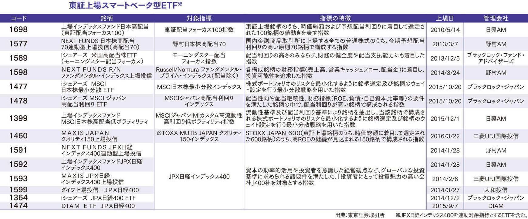 「企業の配当や売上高、ROE(自己資本利益率)、株価変動率などに着目して銘柄を組み入れる指数がスマートベータなのです。いわば、市場全体の値動きの平均との連動を目指すパッシブ運用と、アナリストやファンドマネジャーらによって個別の銘柄を選択するアクティブ運用の中間にある指数と言ったらわかりやすいでしょうか。東証にもさまざまなタイプのスマートベータ型ETFが上場しています(下表参照)」