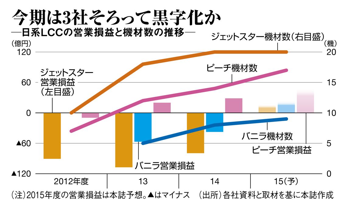 一方のジェットスターも今年度上期(2015年7~12月期)に初の営業黒字となった。「当初の予算は赤字だったが、地方路線も含めた国内線で想定以上の集客ができた。何とか通期でも達成し、黒字化の計画を1年前倒ししたい」と、片岡優会長は意気込む。