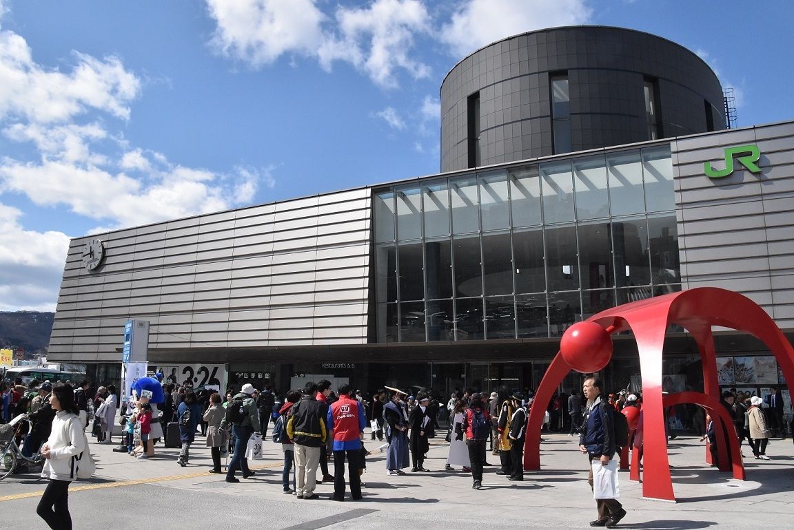 乗り換え時の一瞬、改札を出て新函館北斗の駅舎を撮影した。テントが並び多くの人でにぎわう光景に、函館駅前、そして1年前の北陸新幹線開業時の光景が重なった。未利用地が懸案となっている駅前の区画整理地区では、ホテルなどから成る複合商業施設の建設が進んでいた。次に訪れる時には、景観が大きく変わっているに違いない。