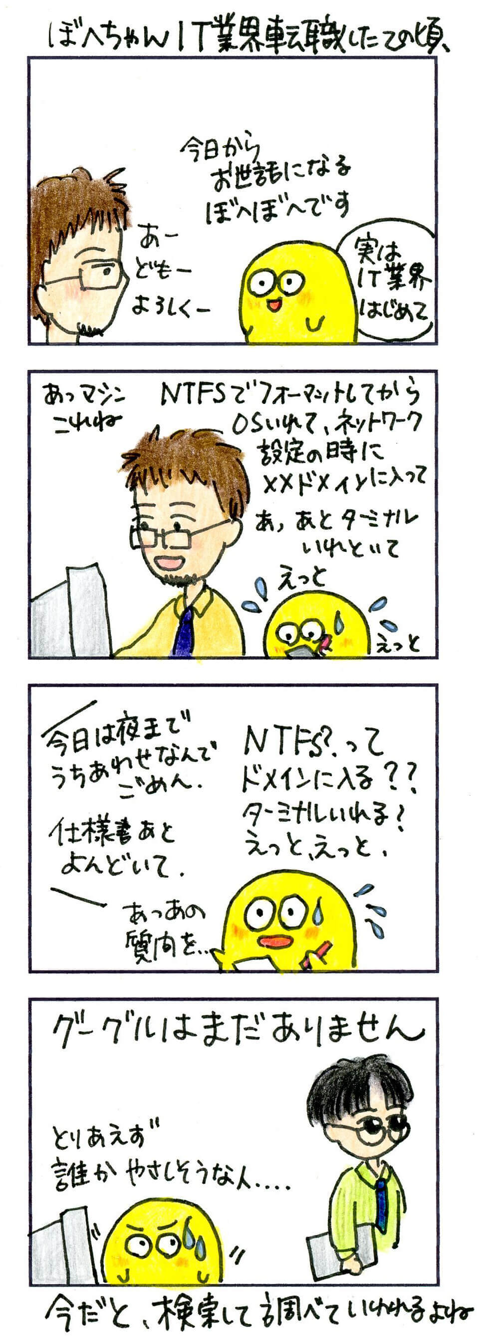 まったく未経験であっても、やる気さえあれば採用してくれる会社があったのが十数年前のIT業界です。その幸運もあって、当時まだ若かったぼへちゃんは、運よくこの業界に入ることができました。