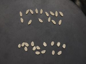 上段がホシユタカの米粒。下段のヒノヒカリと比べて細長い