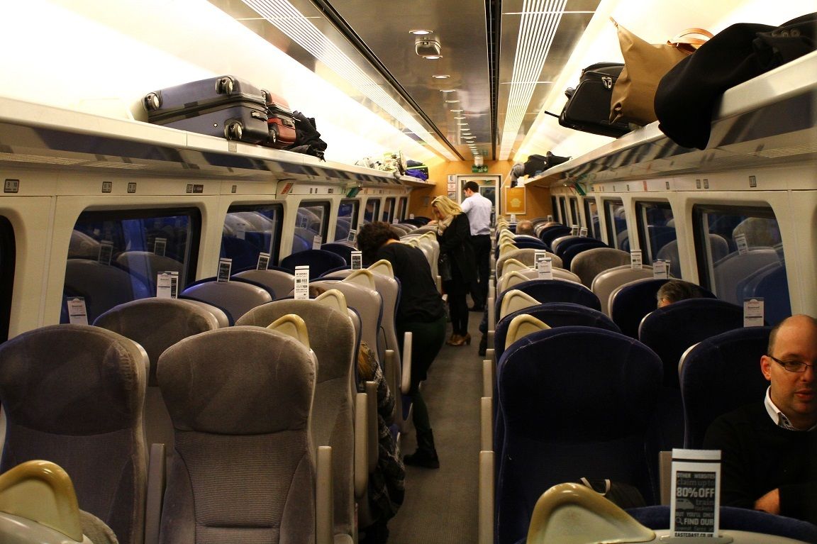 イギリスの長距離列車内。座席の後ろに差し込んであるのは予約席を示す札だ