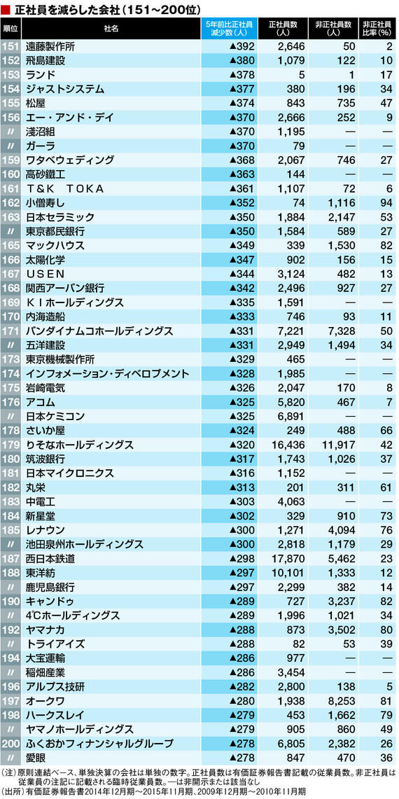 政治・経済・投資 5年前より正社員を減らした500社ランキング 1位パナソニックは13万人減、電機目立つ 3分で読める 公開日時:2016/04/11 05:30 田中 久貴 東洋経済データ事業局 フォロー 1/11 PAGES 2/11 PAGES 3/11 PAGES 4/11 PAGES 5/11 PAGES 次ページが続きます:【201~250位は?】 6/11 PAGES 7/11 PAGES 8/11 PAGES 9/11 PAGES 10/11 PAGES 11/11 PAGES