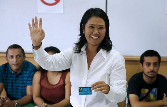4月10日、ペルーで、大統領選の投開票が行われ、3つの出口調査によると、アルベルト・フジモリ元大統領の娘ケイコ・フジモリ氏(写真中央)が首位に立っている。リマで撮影(2016年 ロイター/Mariana Bazo)