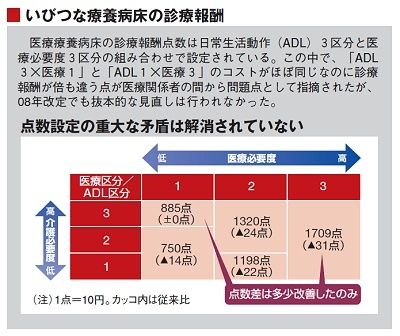 病院は医療区分1の患者を退院させざるをえない。その分、病床は減る。一方で、平均在院日数短縮計画がある。相互に密接に関係しながらも別々に検討されたこの二つの政策に整合性を持たせるために、単なる診療報酬点数上の線引きにすぎなかった医療区分に“基づいた”療養病床削減計画が急きょ、立てられることになったのです。