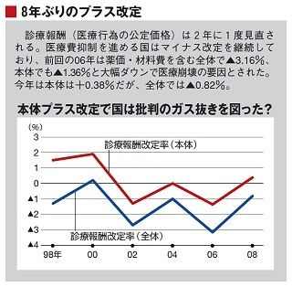この年の12月、診療報酬全体の改定率がマイナス3.18%と過去最大のマイナス幅に決まった(下グラフ)のを受けて、医療療養病床の医療区分1の報酬点数が経営的に成り立たない水準に引き下げられました。私も「そこまで下げて大丈夫なのか」と驚きを持って受け止めていましたが、漠然とした共通目標はあれ、省内の担当部署はそれぞれ別々のことをやっていたのです。