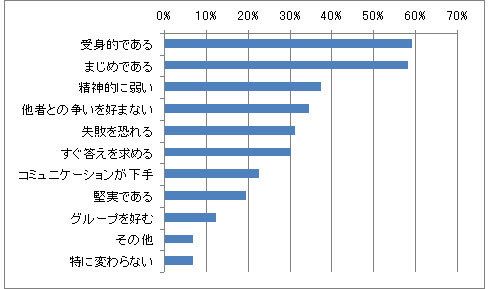 次いで多いのは、「精神的に弱い」(37%)、「他者との争いを好まない」(34%)、「失敗を恐れる」(31%)、「すぐ答えを求める」(30%)だ。「失敗を恐れる」からこそ、自分でチャレンジをするのではなく、マニュアル(答え)を「すぐに求める」。「失敗をすること=他人に迷惑をかける(会社に損害を与える)」と考えるのも、「まじめである」ことの表れかもしれない。