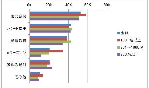 内定者教育で最も多いのは「集合研修」であり、続いて「レポート提出」「通信教育」という順番だ。この3つについては企業規模の差はほとんどない。