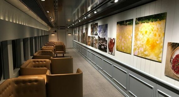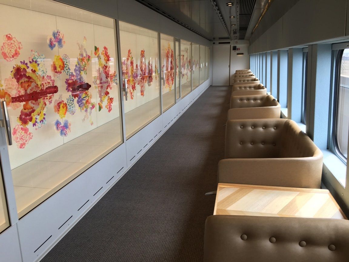 「水面で揺れ動く物体をイメージしました」と、15号車のデザインを行った荒神明香氏が言う。列車がスピードを上げるにつれて、釣り糸で吊り下げられた花びらがゆらゆらと揺れ動く。まさに動く列車だからこそ可能なアート作品だ。