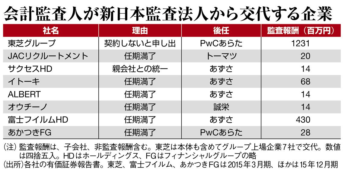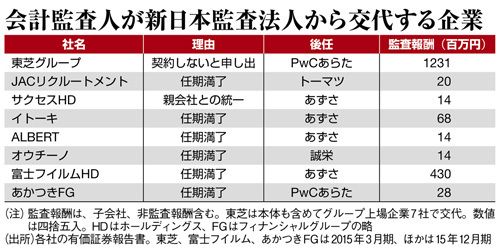 最も多いのは、東芝グループ7社で、東芝本体は2015年12月に、「新日本監査法人から来年度の監査契約を締結しないと申し出があった」と発表。上場する子会社や関連会社も含めて、東芝グループ全体でPwCあらたへの交代を決めた。