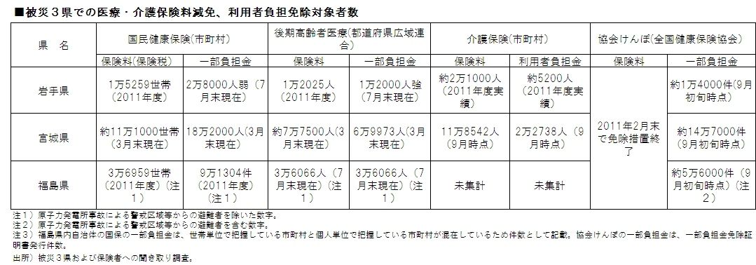 そうした中、医療や介護保険料の減免措置が9月末で打ち切りとなるケースが相次ぐ。岩手、宮城、福島の3県では、津波や地震で住宅が全半壊した住民の多くが保険料の減免対象から外れることになり、10月からは震災前のルールに則った保険料納付を余儀なくされる。その数は国民健康保険(国保)で約14万世帯、後期高齢者医療で約11万人、介護保険では17万人程度にのぼるとみられる(→詳細はこちら)。