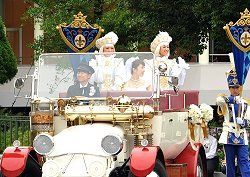 正午少し前に、新郎が式列席者を伴い、シンデレラ城の入り口前に登場。お揃いの制服を着る楽隊に先導された新婦がビークル(オープンカー)で姿を見せると、進行役が、「お集まりの皆様、本日これより、ここ夢と魔法の王国、シンデレラ城の大広間にて結婚の儀を執り行う予定となっておる。新婦入場の際は大きな拍手でお迎え下され」と口上を述べ、結婚式がスタートした。