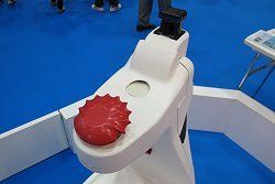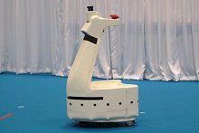 白鳥のような白いボディに貝殻を模した赤いグリップ--。一見、遊戯具に見間違えるほどやわらかな形状の「障害物回避先導ロボットNRW002」は、障害物などを認識し、避けながら、人を先導することができるロボットだ。