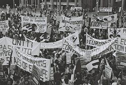 58年のローマ条約発効から間もなく、在アルジェリアのフランス人極右入植者と現地派遣軍は、フランス本国政府の混乱に業を煮やし、反乱を起こした。本国への進撃も辞さないという威嚇のもとに、「愛国者」ドゴールの政権復帰を要求。議会の要請を受けて、ドゴールは12年ぶりにパリに戻り、再び救国内閣を組織した。ところが、ここでドゴールは世界をあっと驚かせる二つの決断を下す。