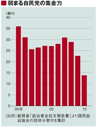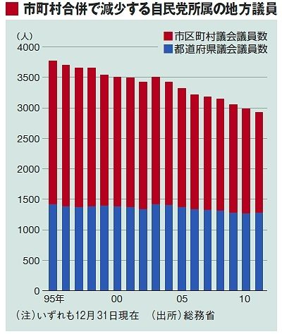 しかし、99年以降の「平成の大合併」を境に、3000以上あった市町村数は1700余りに減少。それにつれて自民党所属の地方議員(都道府県と市区町村議員の合計)も3000人を切るまで減少した。「自民党がいちばん強かったのは地方のはずなのに、小泉政権時代の三位一体改革で交付税が削られ、これで一度に地方ががっくりきた」(山田啓二・京都府知事)という指摘もある。企業・団体献金も右肩下がりだ。