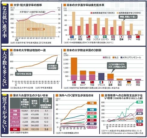 「大学生が増えすぎたから学生の質が低下した」という意見もあるが日本の大学進学率は諸外国と比べて高いわけではない(図の上右)。大学数にしても米国と比べ多くない(図の中右)。大学が、教育や経営を改善し、社会が求める人材をしっかり育てて送り出せれば、大学の存在意義が薄れることはない。