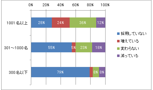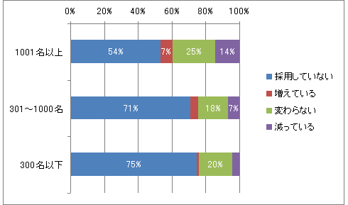 外国人採用は広がっているが、急増しているわけではない。メーカー、非メーカーの規模別データを見ると、「減っている」が「増えている」よりも多くなっており、「増えている」が多いのは「1001名以上」のメーカー系だけだ。「減っている」は12%であるのに対し、「増えている」は24%とダブルスコアになっている。主として大手メーカーのほうが外国人採用に前向きであることがわかる。