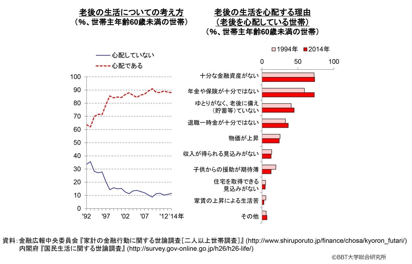 何がそんなに心配なのか。「老後の生活を心配する理由」を見ると、「十分な金融資産がない」「年金や保険が十分ではない」という理由を挙げている人が多いようです。「ゆとりがなく、老後の備えが十分ではない」というのですが、日本人1人当たりの貯蓄額は世界最大です。いくらあったら安心できるのでしょうか。