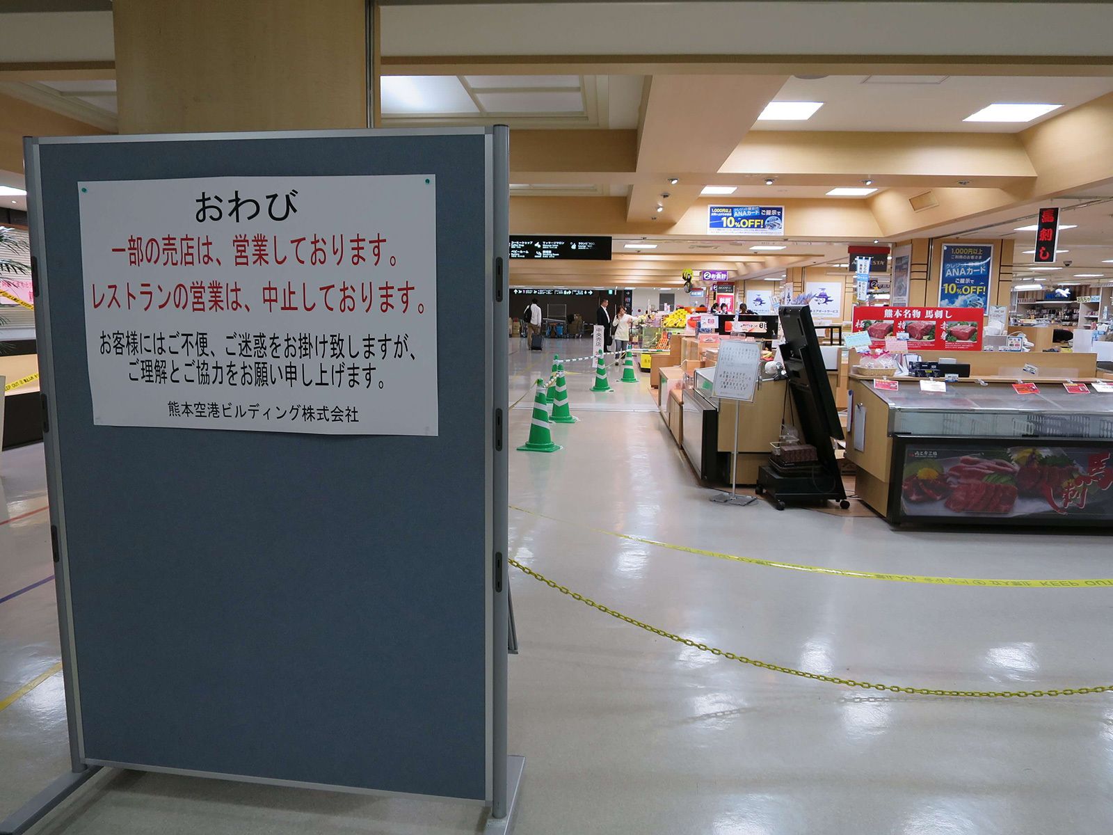 到着ロビーのある1階エリアも天井の一部分の壁が落ちる危険性もあり、立ち入り禁止になっている部分があった。ANA(ソラシドエアを含む)、JAL(天草エアライン、FDAを含む)、ジェットスターの各チェックインカウンターは通常どおりに利用できた。その後、出発ロビーのある2階へ上がってみたが、レストランがあるターミナル東側のエリアはすべて立ち入り禁止となっていた。