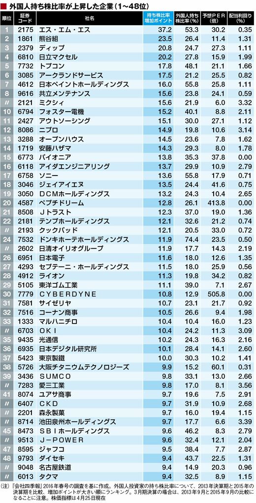 政治・経済・投資 要注意!安倍政権下で外国人が買った200社 アベノミクスの終焉で売られるリスク 3分で読める 公開日時:2016/05/07 06:00 丸山 尚文 東洋経済 記者 フォロー 1/5 PAGES 2/5 PAGES 次ページが続きます:【続いて51位から】 3/5 PAGES 4/5 PAGES 5/5 PAGES