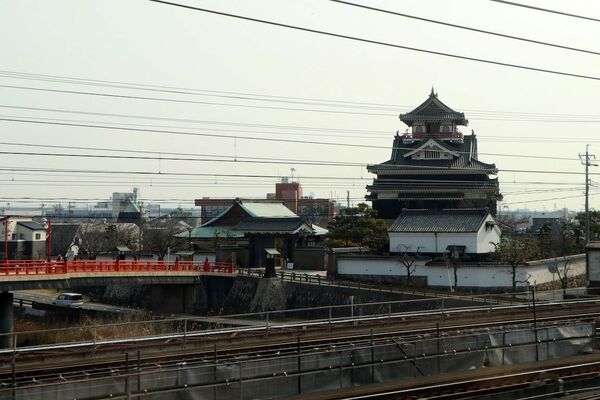 新幹線に乗っていると、1600年の関ケ原の戦い、佐和山城落城、そして1622年の彦根城築城という歴史の流れを、数分間で眺めることができる。もっとも、彦根城は新幹線から3kmほど離れており、市街地を挟むため霞んでしまうことも多い。