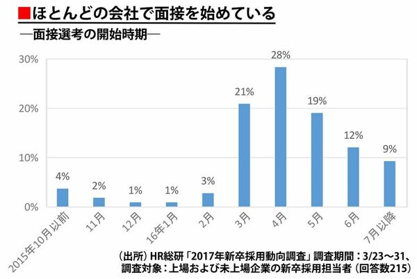 まず、「面接選考をいつから開始するのか(開始しているのか)」を聞いてみたところ、最も多かった回答は「4月から」で全体の約3割もあった。3月1日の採用広報解禁前にすでに面接選考を開始していた企業が1割以上あり、「3月から」「5月から」とする企業もそれぞれ約2割あり、合計で8割以上の企業が経団連の解禁日である6月以前に面接選考を開始している。